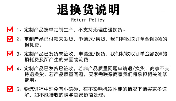7.我公司有足够的易损件供应。如果购买者要求订购备件,我公司将收取开支以提供物流服务。
